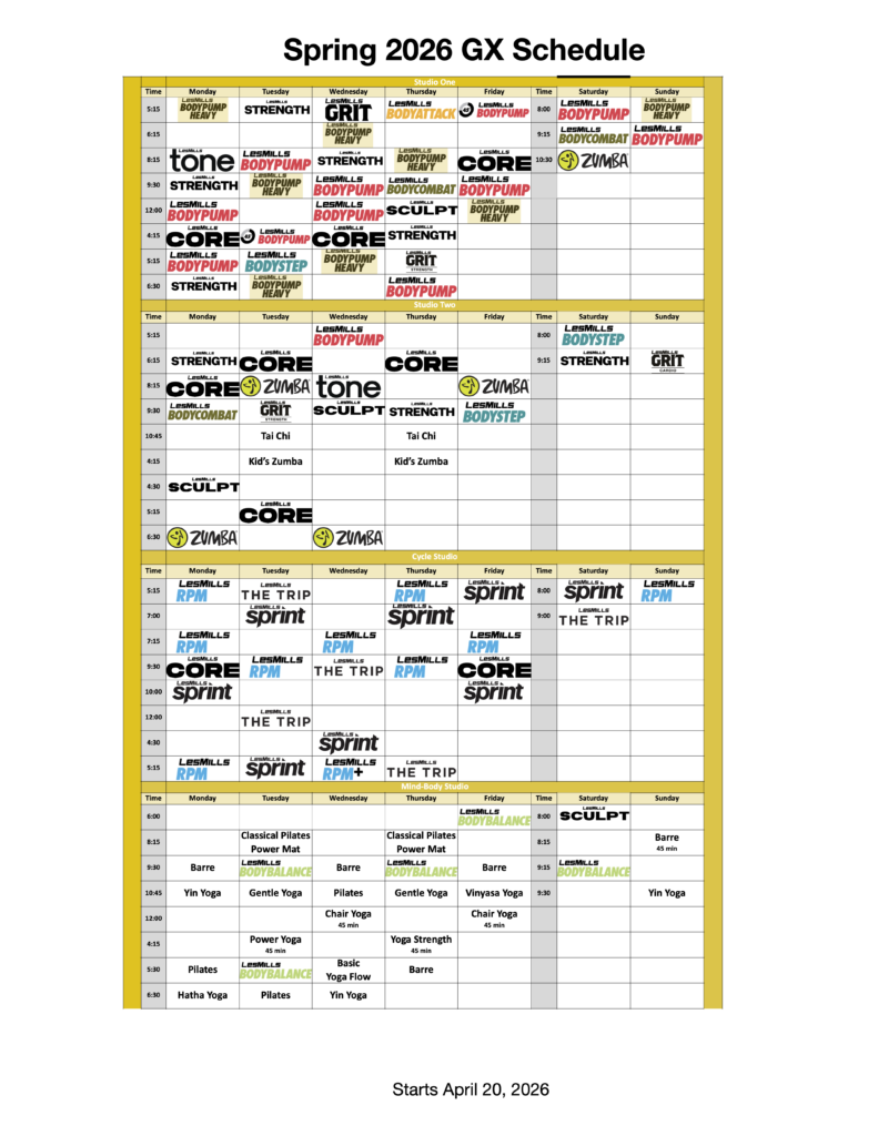 We currently a wide variety of Les Mills™ Group Fitness Classes: BodyPump™, BodyCombat™, BodyBalance™, BodyStep™, RPM™, BodyAttack™, Les Mills Core™, Les Mills Grit™, Les Mills Sprint™, Les Mills Strength, and Les Mills Tone™, Les Mills Sculpt, The Trip™.  New this year… Les Mills BodyPump Heavy™.